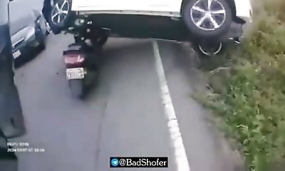 Un scooteriste témoin d'un carambolage entre deux voitures se retrouve dans une situation insolite et assez comique sur la route.