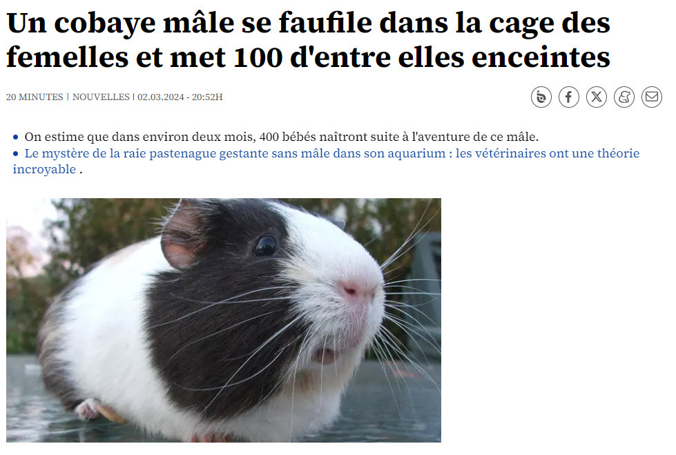 Un incident surprenant s'est produit à Hatton Adventure World, au Royaume-Uni, où un cobaye mâle, surnommé Randy, s'est échappé pour rejoindre les femelles. Suite à cette escapade, environ 100 femelles sont désormais enceintes, prévoyant l'arrivée de 400 bébés cobayes. L'événement a provoqué un certain amusement parmi le personnel, alors que Randy avoir beaucoup maigri après son aventure.