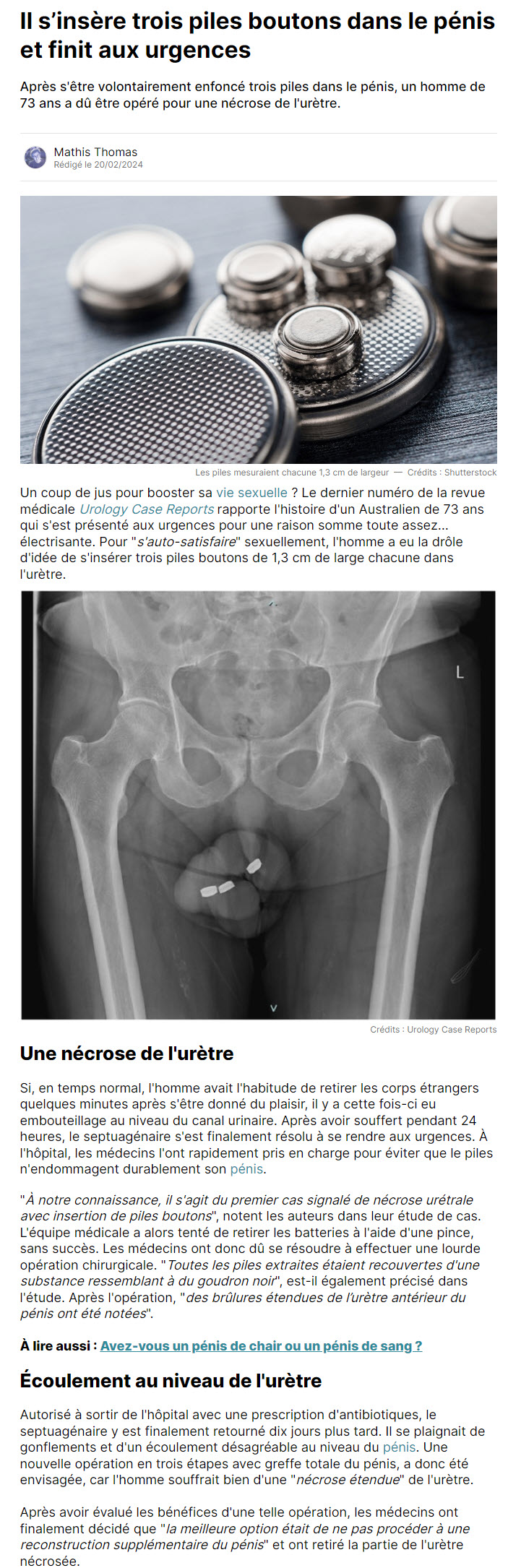Dans un cas médical inhabituel, un Australien de 73 ans s'est retrouvé aux urgences après une tentative extrême d'auto-satisfaction sexuelle. L'homme avait inséré trois piles boutons dans son urètre, une pratique qui s'est soldée par une nécrose nécessitant une intervention chirurgicale d'urgence. Habituellement capable de retirer de tels objets après usage, il s'est trouvé dans l'incapacité de le faire cette fois-ci, provoquant un blocage et des dommages sévères à son urètre.